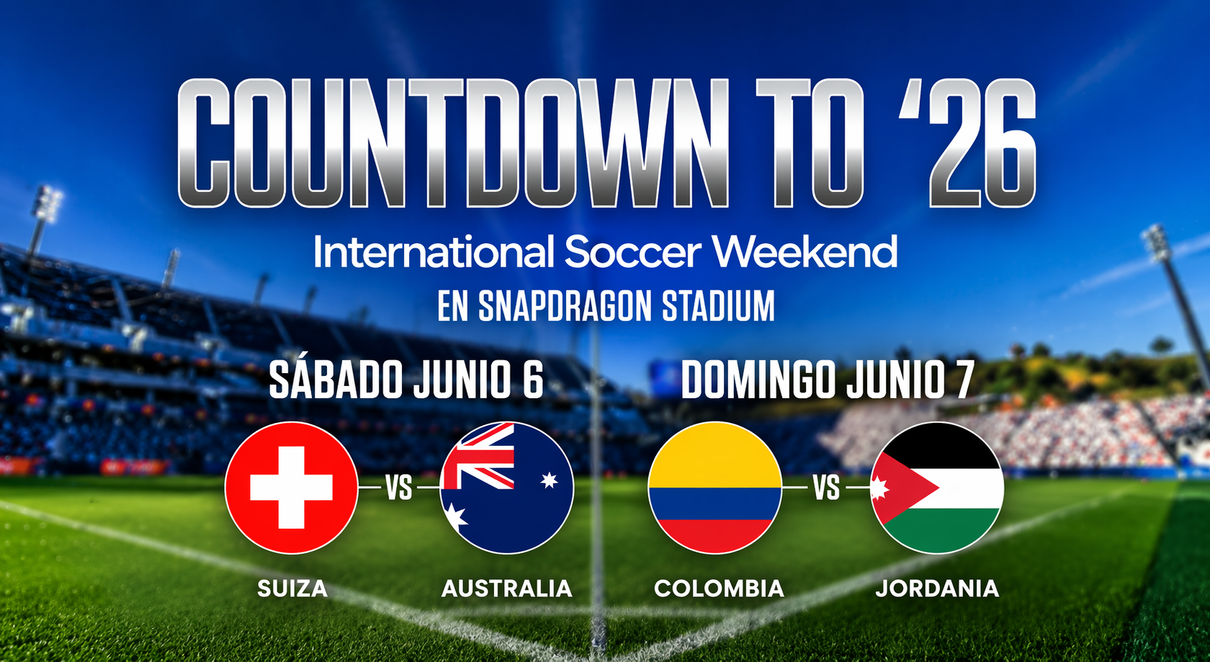 SAN DIEGO, California.— Snapdragon Stadium será sede de dos partidos amistosos internacionales en junio como parte de la serie “Countdown to ’26”, con los encuentros Suiza vs. Australia el 6 de junio y Colombia vs. Jordania el 7 de junio.